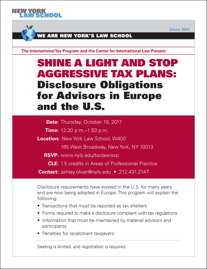 /The International Tax Program and the Center for International Law at New York Law School will co-sponsor a free CLE program on Thursday, October 19, featuring Ruchelman guest speakers Stanley C. Ruchelman, Chairman; Fanny Karaman, LL.M. (Taxation) ’12, Associate; and Sheryl Shah, Associate.